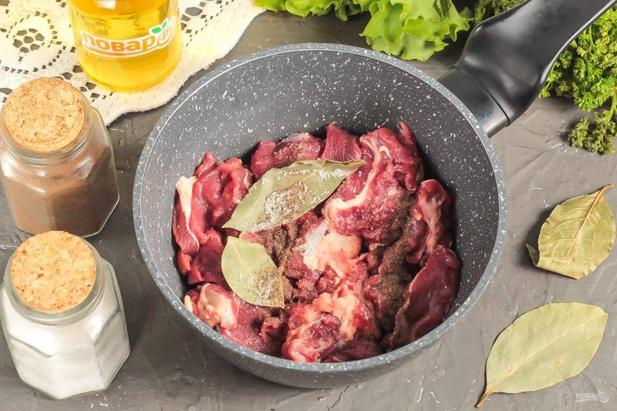 Влейте в ковш или казан растительное масло, выложите нарезанное мясо, всыпьте соль, молотый черный перец и лавровые листья.
