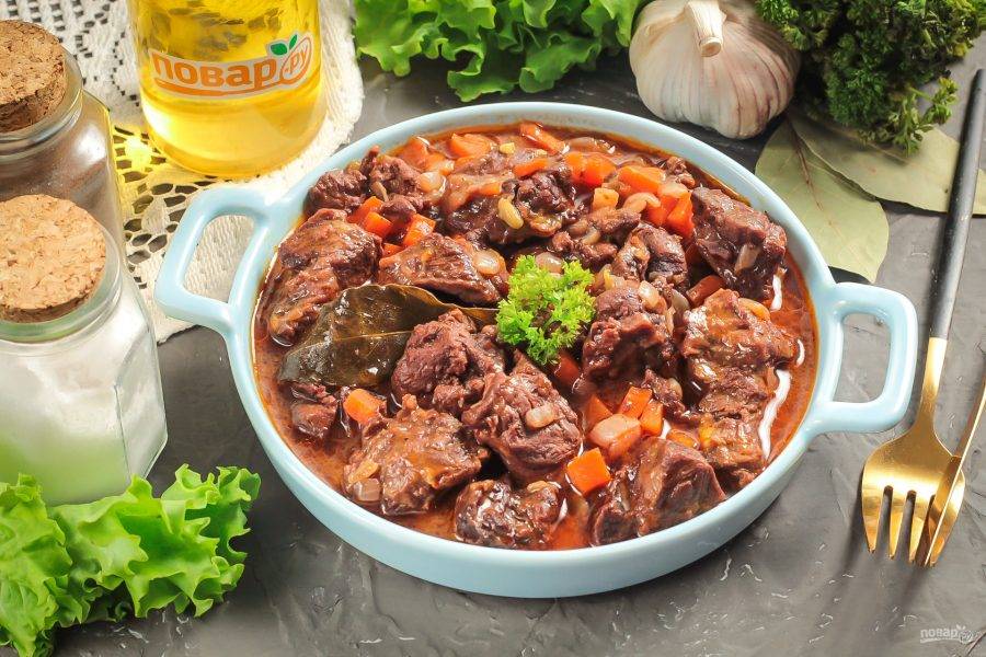 Влейте красное вино и поместите емкость на плиту. Доведите до кипения и уваривайте на минимальном нагреве примерно 1,5 часа, время от времени подливая горячую воду, когда жидкость начнет испаряться. В самом конце приготовления можно добавить немного приправ и специй по вашему вкусу. Морковь и лук должны стать мягкими, а мясо — нежным, сочным.