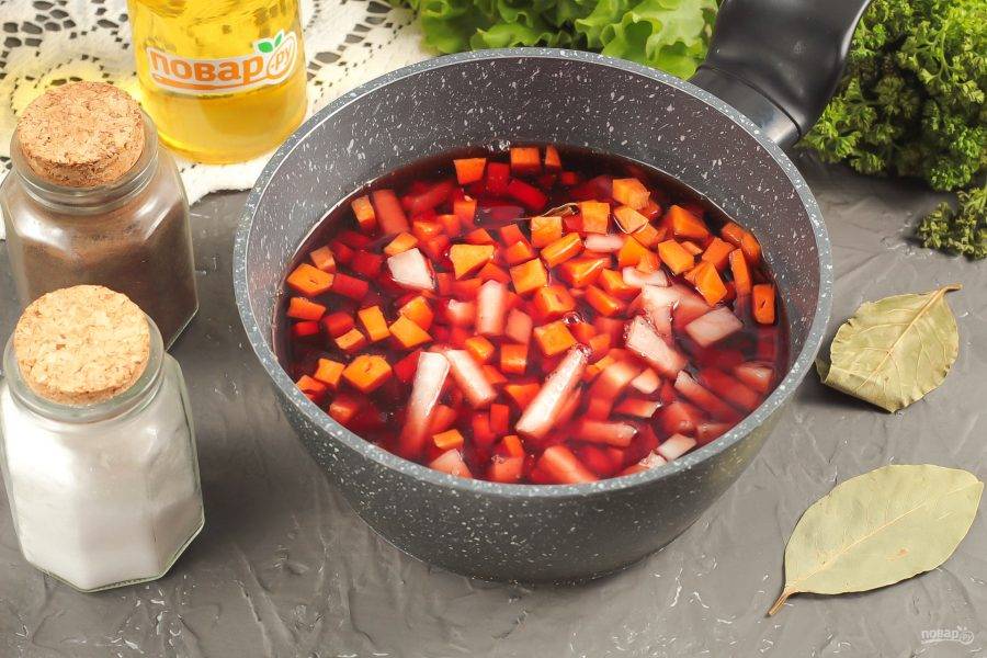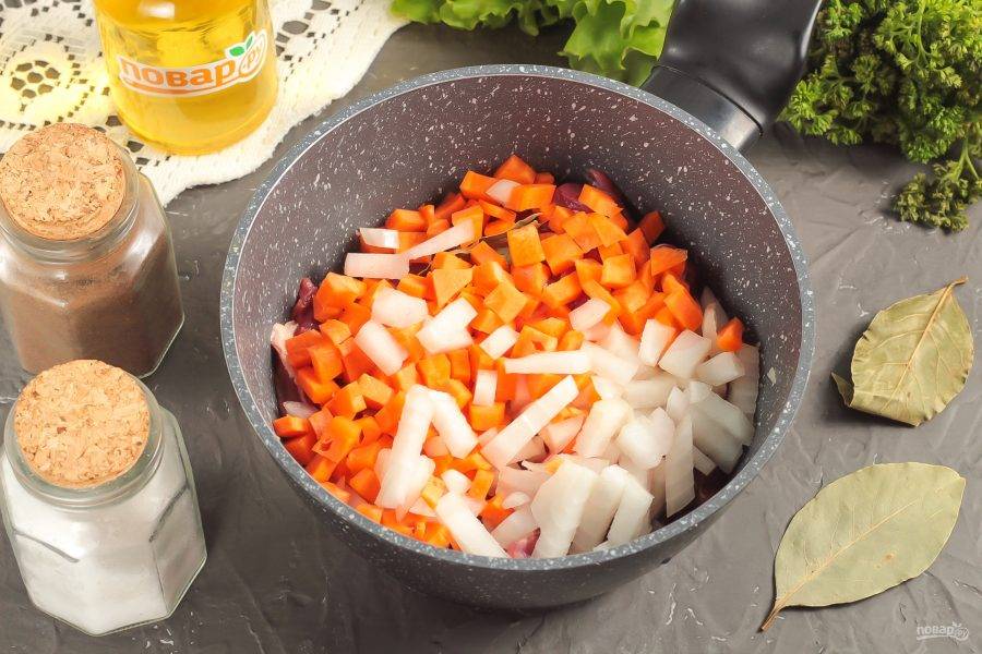 Нарежьте морковь и лук мелкими кубиками и добавьте в емкость. По желанию можно дополнить овощи нарезанным корневым или стеблевым сельдереем.