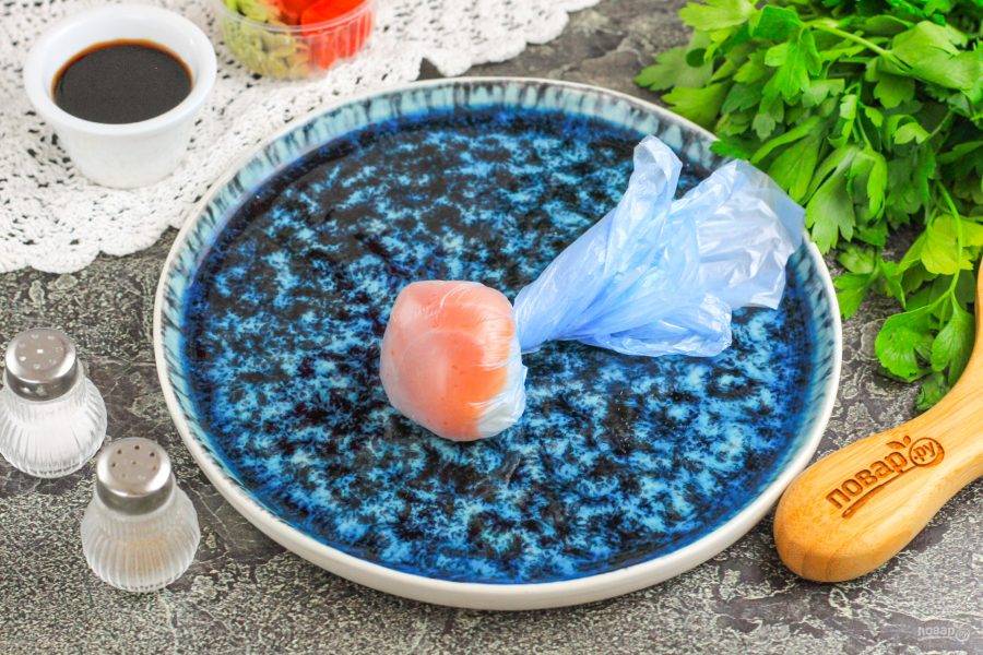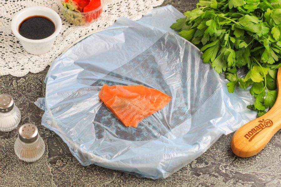 Чтобы приготовить округлые шарики, можно воспользоваться пакетом или пищевой пленкой. Выложите пакет на тарелку, а в его середину — тонкий ломтик красной рыбы.
