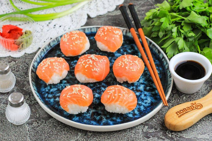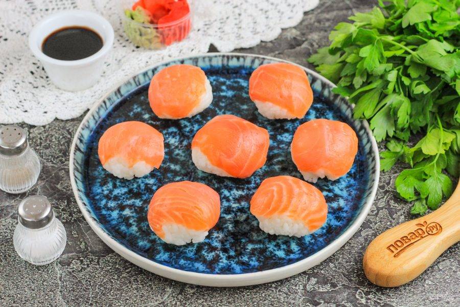 Выложите его на тарелку или блюдо. Таким же образом приготовьте и остальные суши.