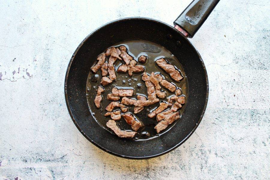 В сковороде разогрейте растительное масло и выложите говядину, порезанную тонкими полосками. Обжарьте ее в течение одной минуты.