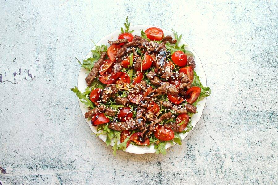Посыпьте салат кунжутом, полейте бальзамическим кремом и сразу подавайте к столу.