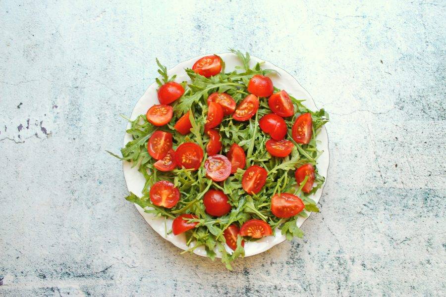 Черри разрежьте пополам или на четыре части и разложите поверх рукколы.