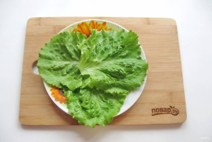 Листья салата помойте, обсушите и выложите на тарелку.
