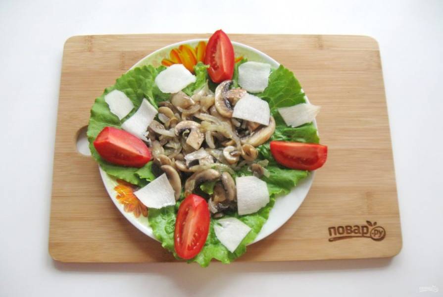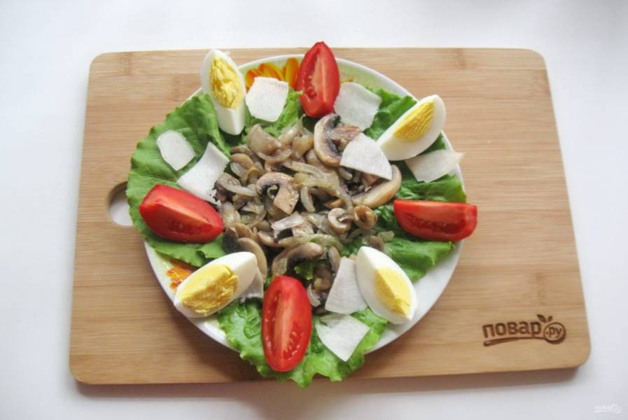 На салат выложите жареные шампиньоны с луком.