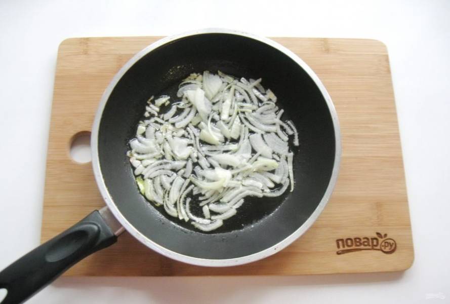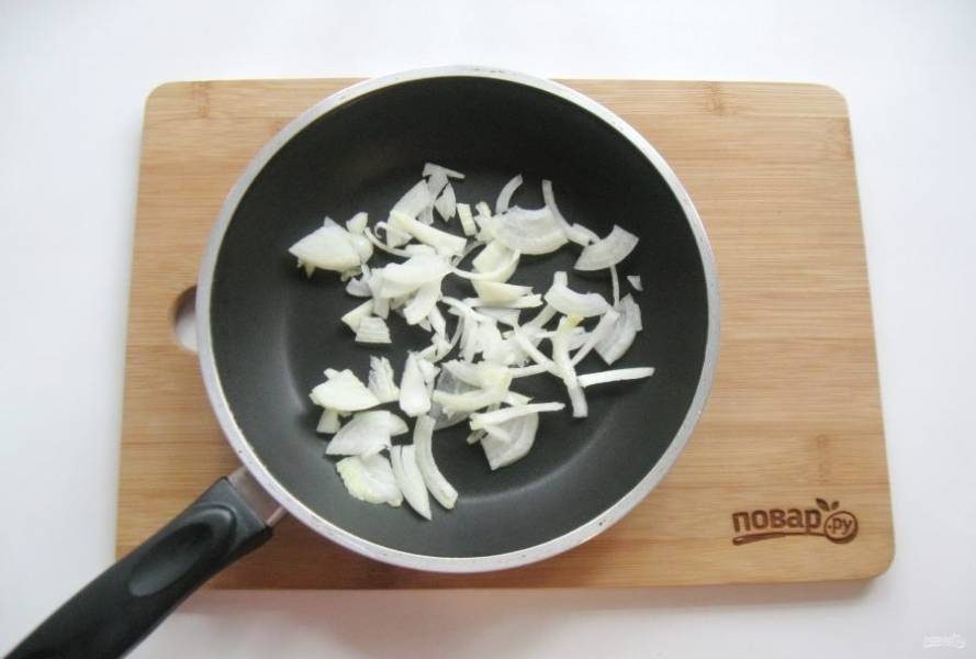 Репчатый лук очистите, помойте и нарежьте полукольцами. Выложите в сковороду.