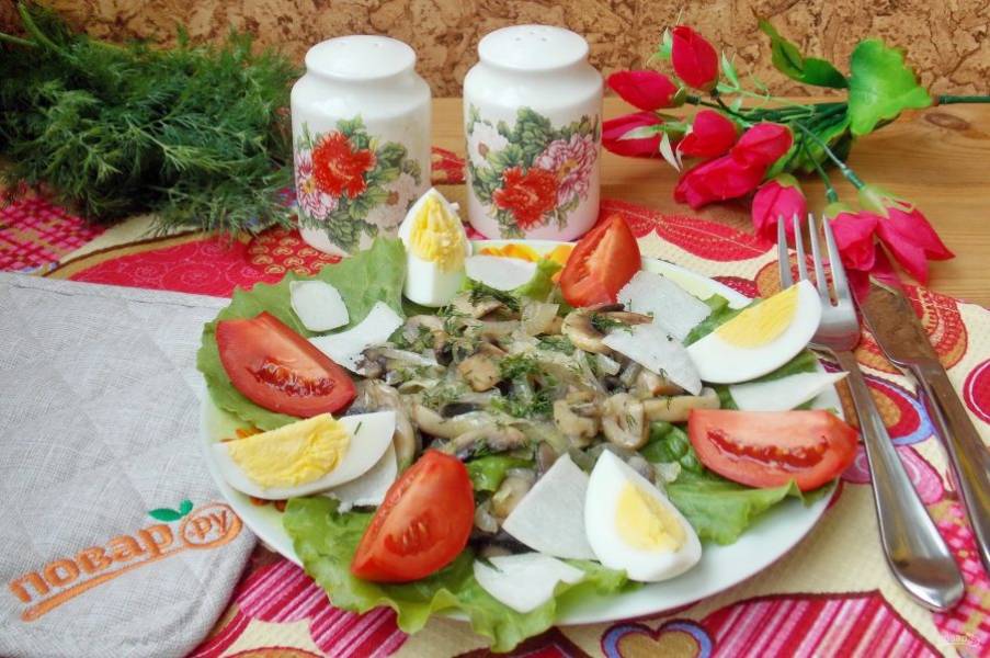 Грибы с луком и салат полейте заправкой. Выложите нарезанный помидор и нарезанный пластинками топинамбур.