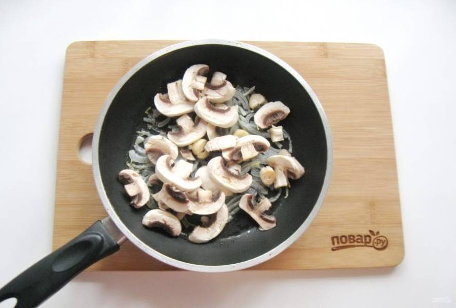 Шампиньоны очистите и нарежьте пластинами. Добавьте в сковороду к луку.