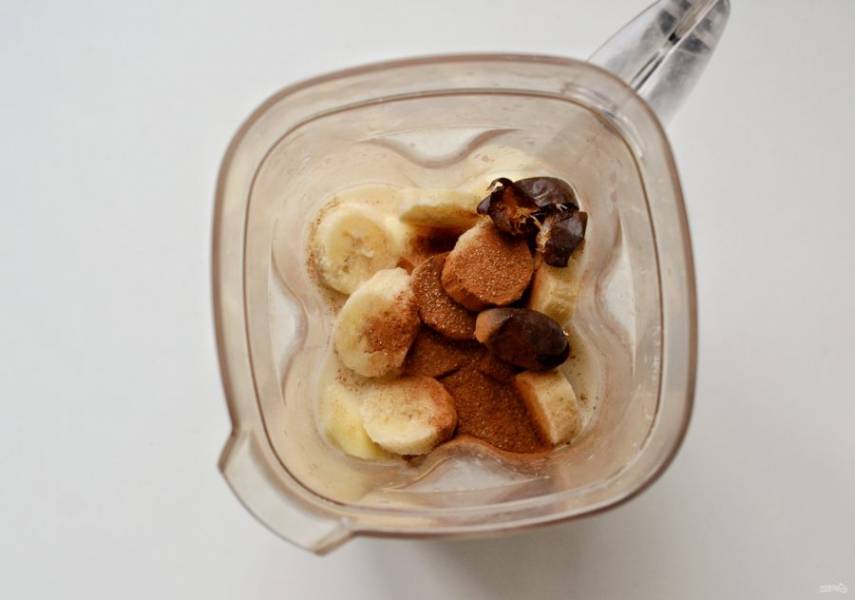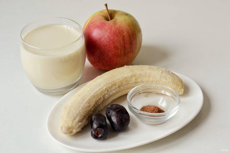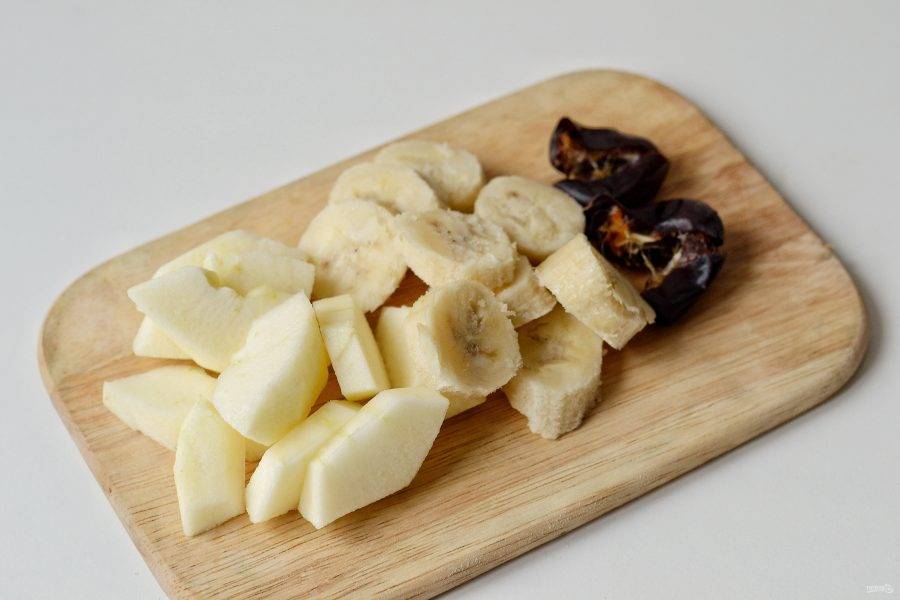 Яблоко очистите от кожуры, удалите семена, нарежьте ломтиками. Банан нарежьте кружочками. Финики очистите от косточек.