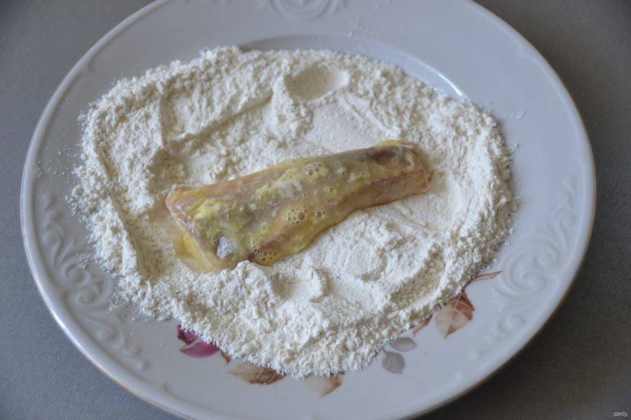 Снова обваляйте рыбу с обеих сторон в муке и отправляйте на сковороду.