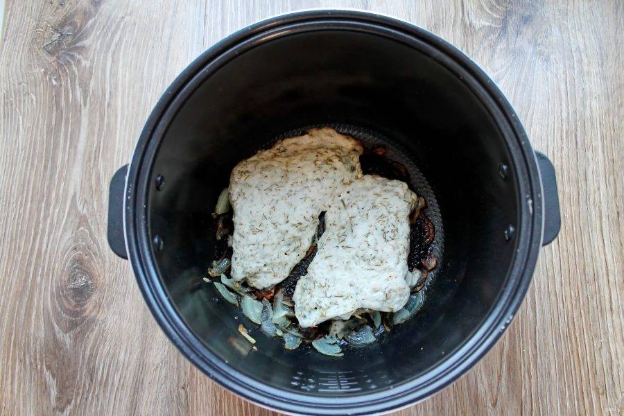 Закройте крышку мультиварки и включите режим "Выпечка" на 25-30 минут. Все зависит от толщины кусков.