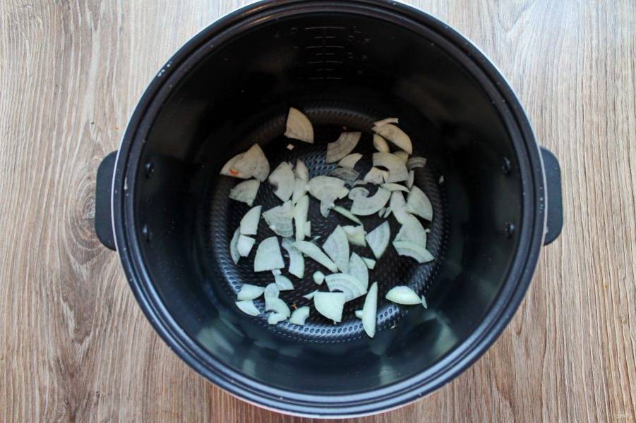 Чашу мультиварки смажьте растительным маслом. Репчатый лук почистите и порежьте. Выложите тонким слоем на дно.