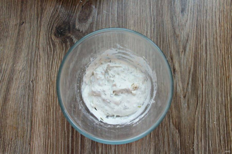 В миску выложите сметану, соль, перец и сухую зелень. Все хорошенько перемешайте.