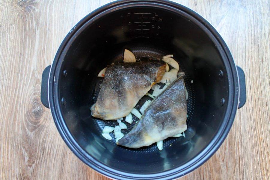 Рыбу посолите и поперчите. Выложите куски терпуга на лук.