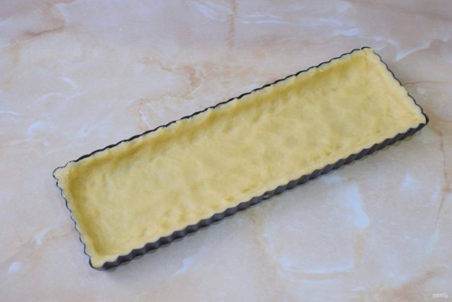 Большую часть теста распределите по форме для выпечки. Она может быть любой формы. Сформируйте небольшие бортики.