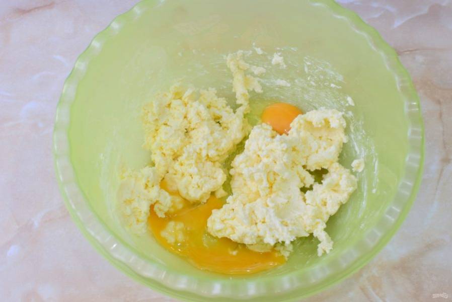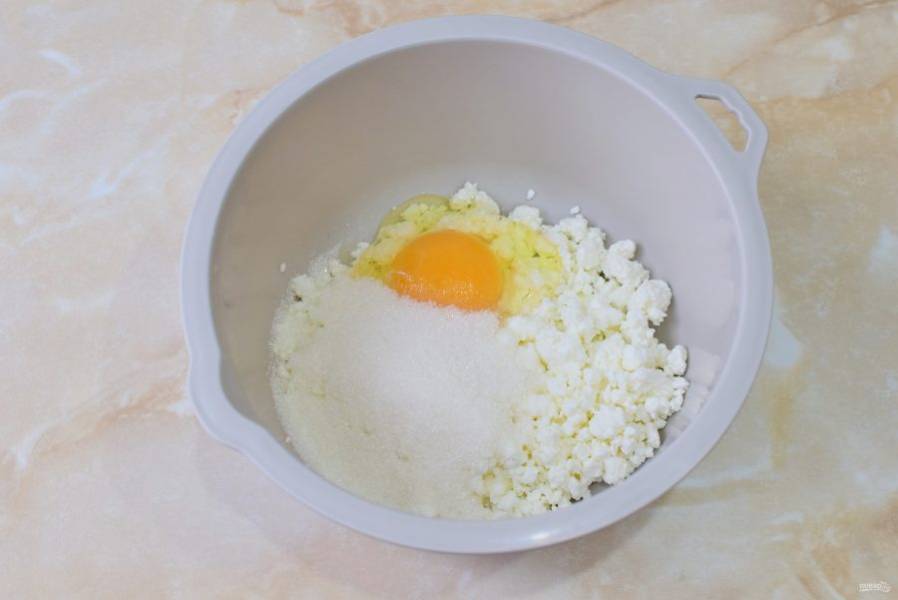 Для приготовления начинки соедините творог, яйцо и сахар. Смешайте вилкой. Если творог очень влажный, то можно добавить немного манки или крахмала.