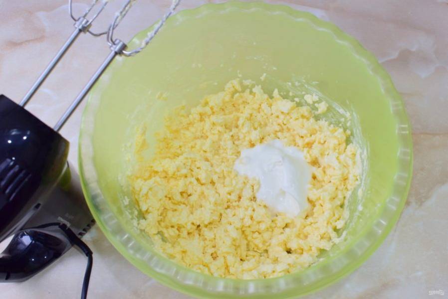 Постепенно добавляйте муку с содой и вмешивайте её в тесто.