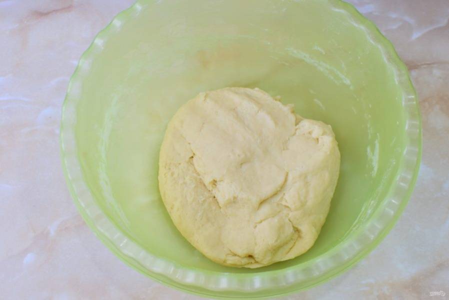 Тесто долго месить не надо, иначе оно забьётся мукой. Как только оно стало формироваться в комок и перестало липнуть к рукам — муку больше не добавляйте. Разделите тесто на две неравные части. Меньшую часть уберите в морозилку, чтобы оно застыло.