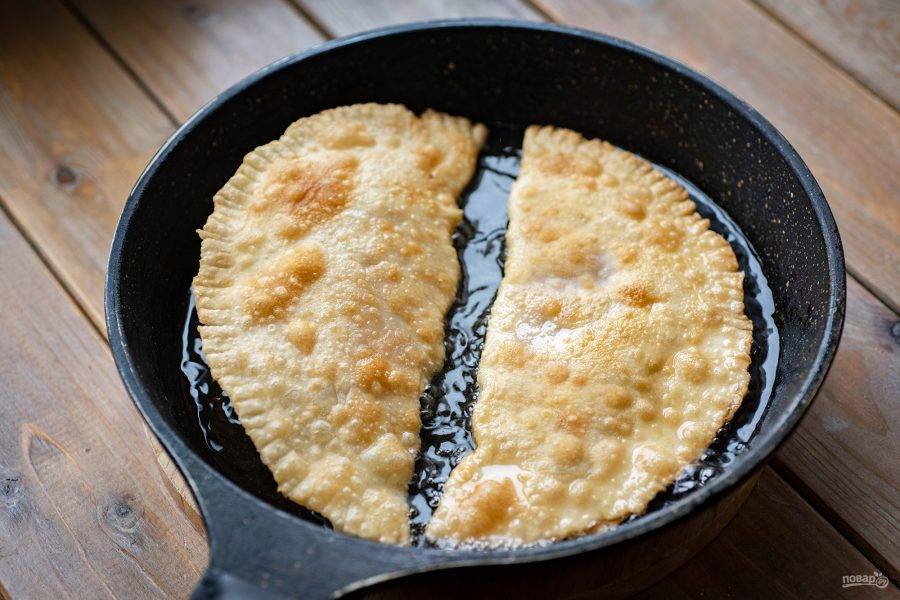 В сковороде хорошенько разогрейте растительное масло, обжаривайте на среднем огне чебуреки с двух сторон до золотистого румянца и появления аппетитных пузырьков на тесте.