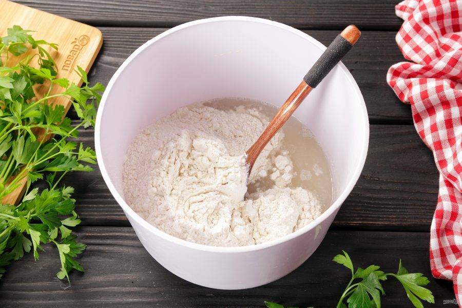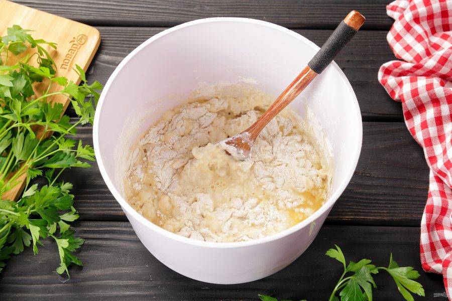 Перемешайте и добавьте частями муку.