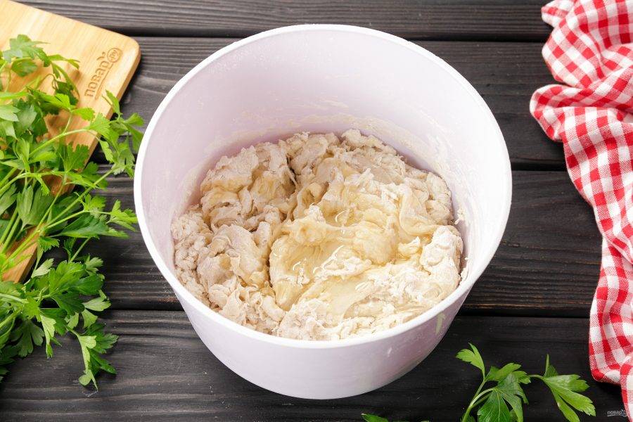 Затем добавьте растительное масло, ещё раз перемешайте и переложите тесто на стол, присыпанный мукой и продолжите замес руками. Месите тесто долго (не менее 7-10 минут), до гладкого состояния. По мере надобности подсыпайте муку.