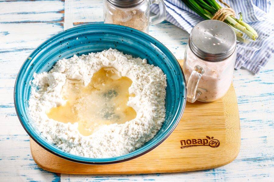 Просейте пшеничную муку высшего сорта в глубокую емкость, сделайте в муке углубление и всыпьте соль. Влейте оливковое масло и теплую воду. Лучше всего добавлять теплую воду, чтобы клейковина быстрее активизировалась. Кстати, на этом этапе в тесто можно всыпать измельченные сушеные пряности: розмарин, тимьян, орегано и прочие - по вашему вкусу.