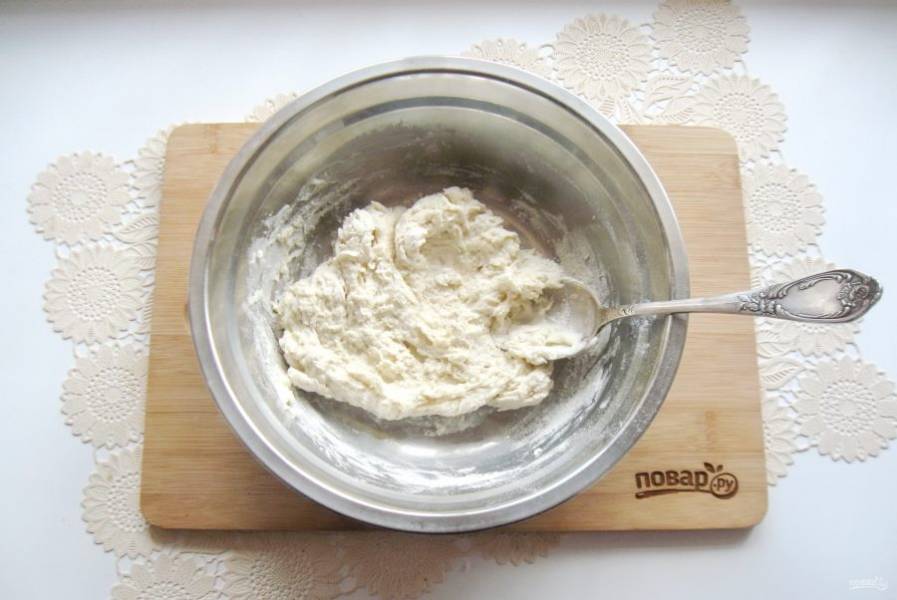 Постепенно добавляйте муку и замешивайте достаточно крутое, но эластичное тесто. Выложите тесто в полиэтиленовый пакет или заверните в пищевую пленку. Дайте ему отдохнуть 25-30 минут.