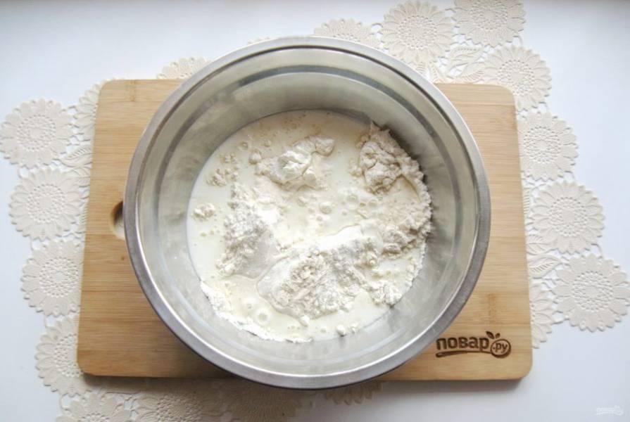 Воду немного подогрейте и смешайте со сметаной. Добавьте в миску с мукой и солью.