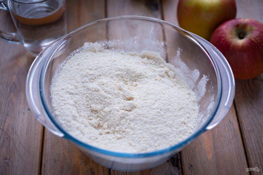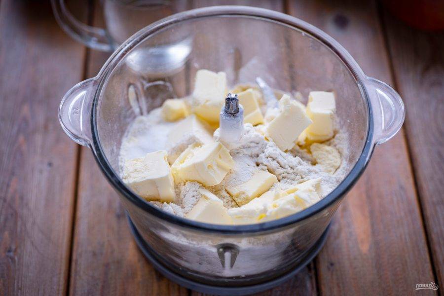 В чашу блендера высыпите всю муку, добавьте соль и ледяное масло, нарезанное кусочками. Запустите устройство. В итоге должна получиться очень мелкая крошка с маслом. Также, если блендером вам пользоваться неудобно, то вы можете очень быстро перетереть муку с ледяным маслом руками.