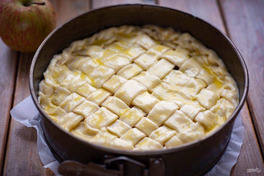 Вторую часть теста раскатайте в тонкий пласт и нарежьте на полоски шириной в 1.5 см. Выложите полоски из теста поверх яблок, переплетая их, как на фото. Смажьте переплетенные полоски теста взболтанным желтком. Пирог отправьте выпекаться в уже разогретую до 180 градусов духовку на 40-45 минут.