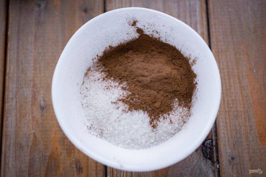 В мисочке смешайте 1 ч.л. молотой корицы и 80 грамм сахара.
