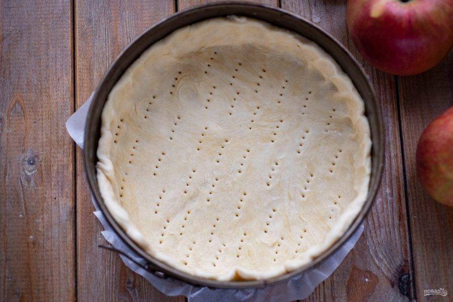 Одно яйцо аккуратно поделите на желток и белок по разным мисочкам. Тесто разделите на 2/3 и 1/3 части. Большую часть теста раскатайте в пласт и выложите в форму, формируя бортики высотой примерно в 4 см. Горизонтальную часть заготовки наколите вилкой и смажьте взболтанным белком.