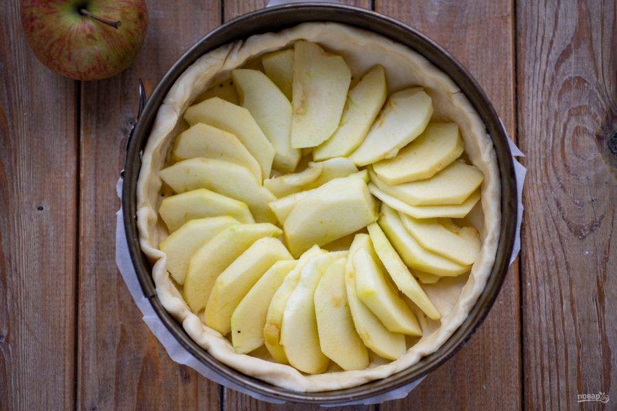 Яблочные ломтики произвольно выложите в форму с основой из теста для будущего пирога.