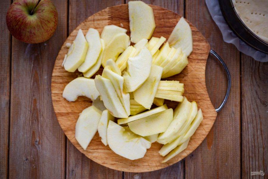 Помойте 2-3 крупных яблока и снимите с них кожуру, нарежьте тонкими ломтиками.