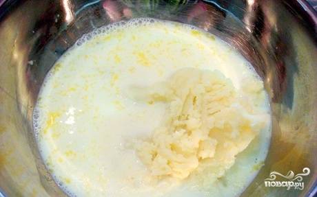 Переложите пюре в миску, добавьте к нему теплый кефир, вбейте сырые куриные яйца, Присолите и тщательно размешайте все ингредиенты до однородности.