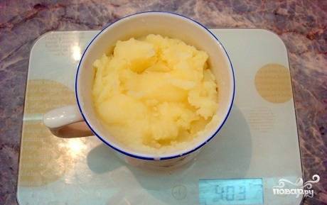 Сухое картофельное пюре высыпьте в миску и залейте кипятком. Дождитесь, пока оно набухнет. Можно использовать пюре из свежего картофеля, предварительно его отварив.
