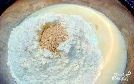 Муку просейте, чтоб насытить ее кислородом. Добавьте к ней сухие дрожжи. Соедините сухие продукты. Добавьте их к яично-кефирной смеси. Должно получиться довольно вязкое тесто.