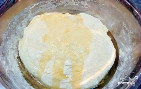 Понемногу добавьте остаток муки, вымешайте гладкое и эластичное тесто. К нему влейте растительное масло и снова все перемешайте. Оставьте тесто в миске, чтоб оно подходило.