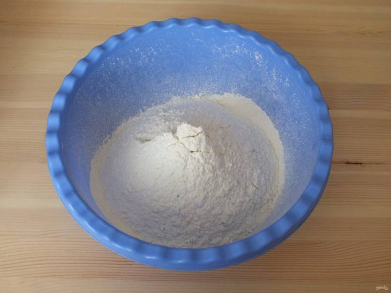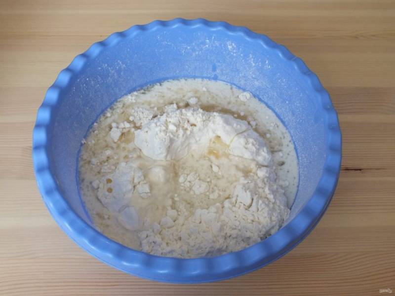 Вылейте содержимое стакана в чашу с мукой и замесите тесто.
