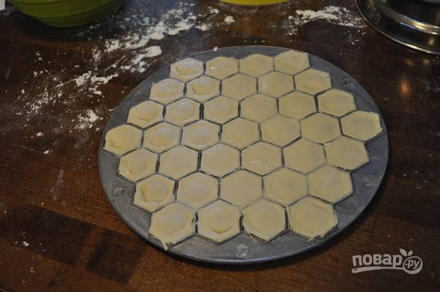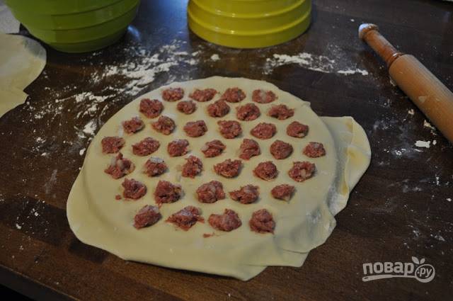 5. После разделите на несколько частей и тонко раскатайте. Можно лепить пельмени вручную или с помощью пельменницы.
