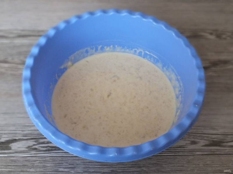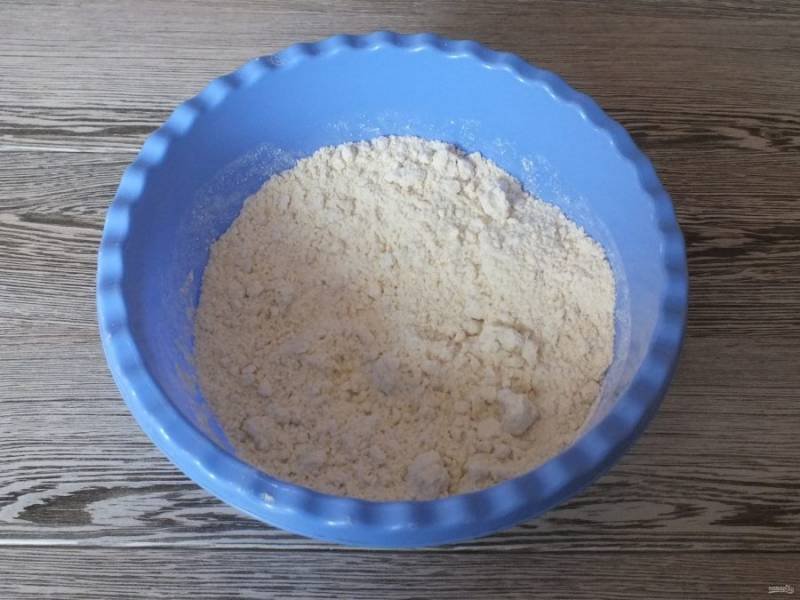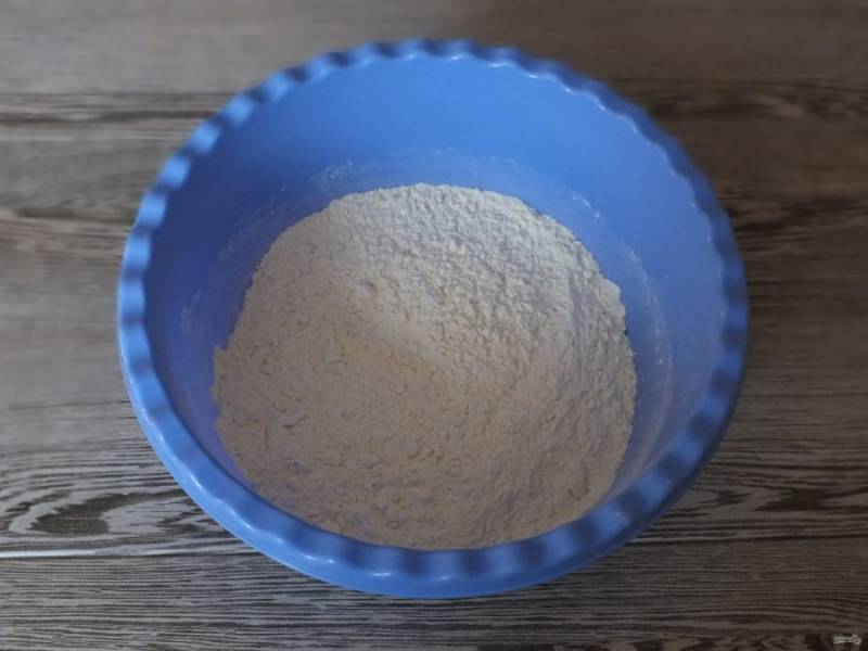 В чаше смешайте сухие ингредиенты: 1/2 часть указанного количества муки, сахар, соль.