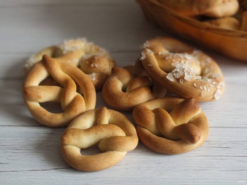 По истечении времени разделайте на желаемые изделия и выпекайте. Я испекла печенье в форме кренделей. При температуре 180 градусов они выпекались 25 минут. По вкусу такое печенье напоминает сушки.