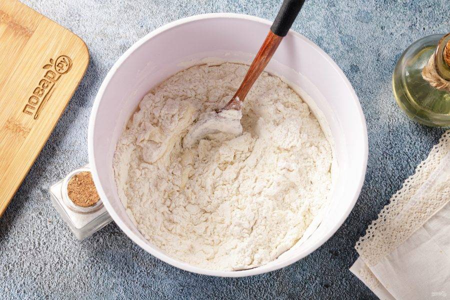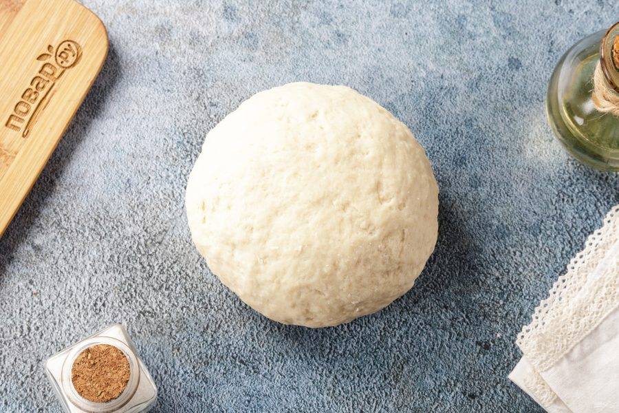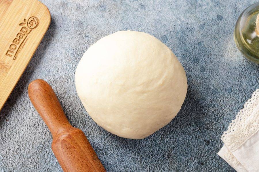 Если тесто сильно липкое, добавьте частями ещё муку. Вымешивайте тесто не менее 10 минут. Оно должно быть мягкое и эластичное. Соберите тесто в шар, накройте полотенцем и дайте полежать 20 минут.