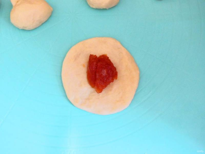 Сформуйте пирожки. Для этого возьмите одну тестяную заготовку, разомните в лепешку. На середину выложите начинку. Чуть больше чайной ложки. Я для начинки взяла густое яблочное повидло.