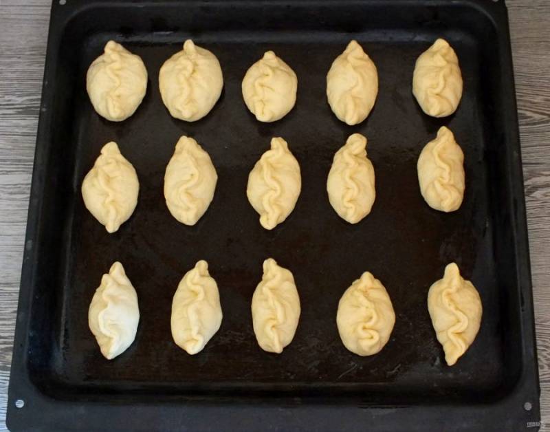 Подготовленные пирожки выложите на противень смазанный маслом. Поставьте выпекаться в разогретую до 180 градусов духовку на 15-20 минут.