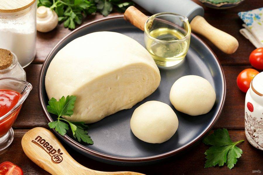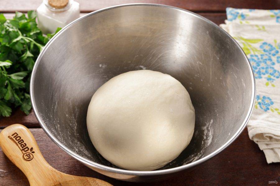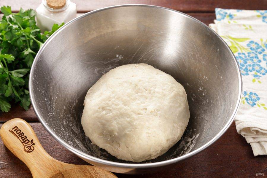 Вымесите тесто на столе, чтобы оно полностью отлипало от рук и стало послушным. Если потребуется еще муки плюс к указанному количеству, то немного добавьте, чтобы тесто получилось эластичное. Соберите тесто в шар, накройте полотенцем и дайте полежать 20-30 минут.