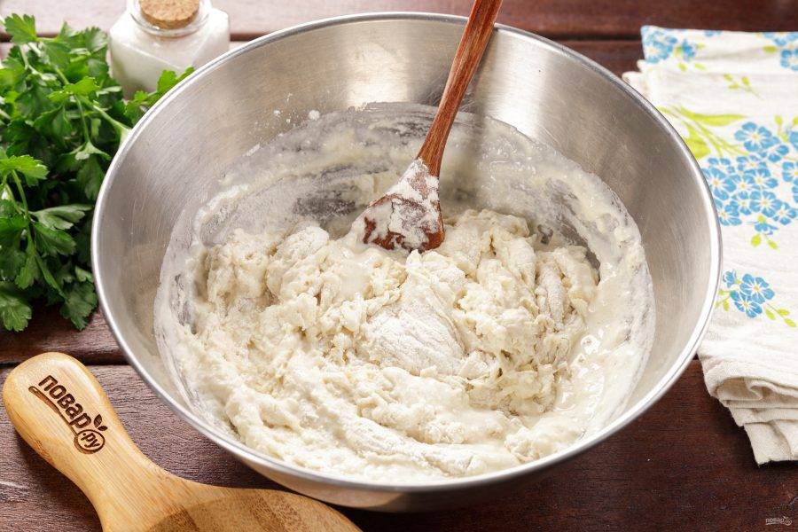 Затем, когда трудно станет мешать, продолжите замес руками.