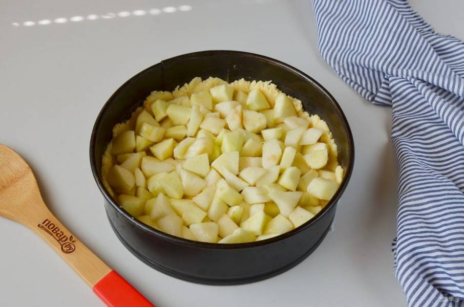 Включите духовку на 180 градусов, пусть разогревается. Разъемную форму застелите пергаментом, положите 2/3 теста, пальцами уплотните и сформируйте невысокие бортики.