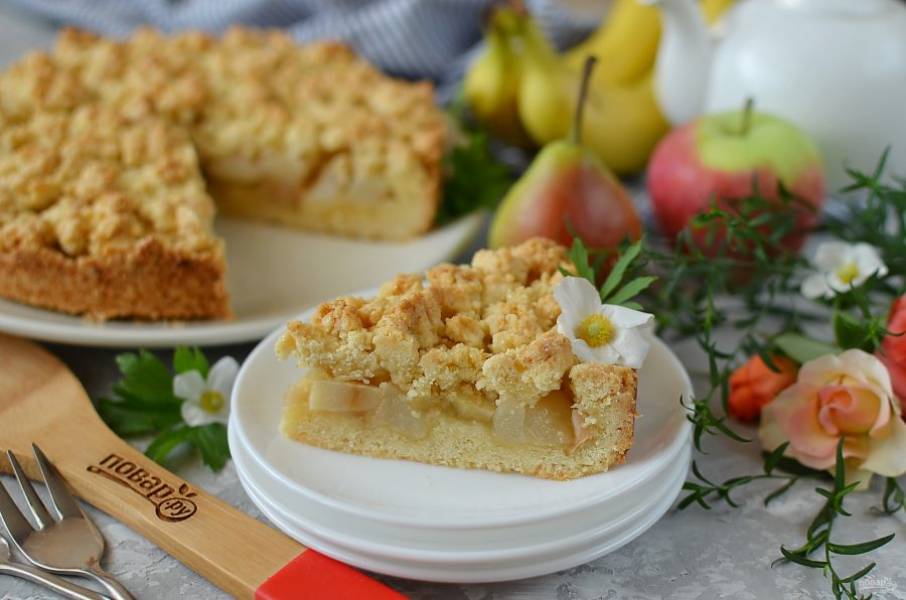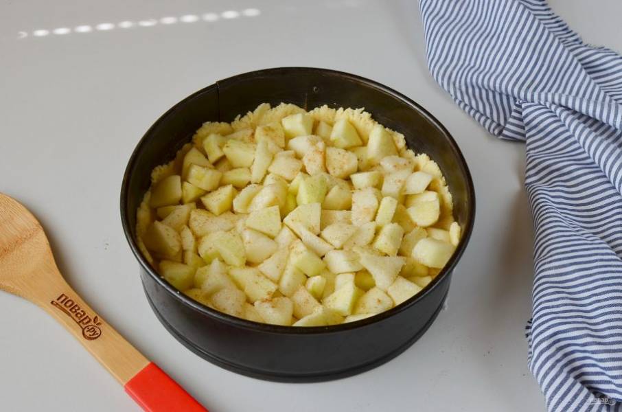 Распределите оставшуюся треть рассыпчатого теста сверху, края немного пальцами прижмите, чтобы пирог имел красивый вид.